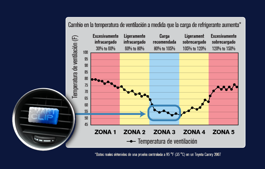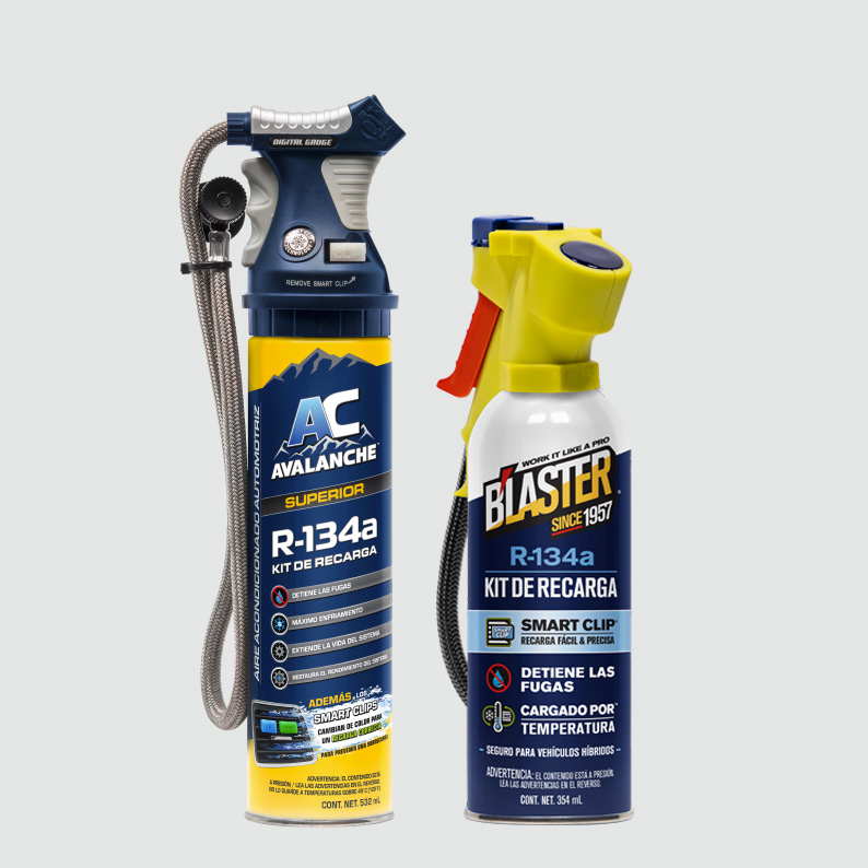 Elige un paquete de recarga todo en uno para obtener una solución rápida y sencilla para recargar el sistema de aire acondicionado de tu automóvil. Utiliza Smart Clips para medir la temperatura de ventilación y ayudar a evitar la sobrecarga del sistema.