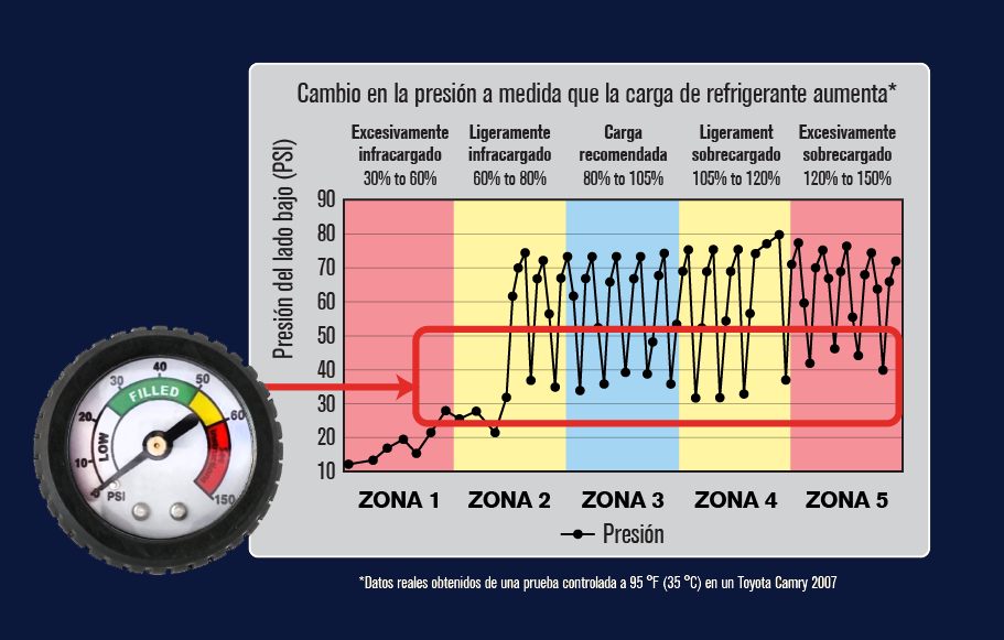 Las válvulas TXV regulan la presión del sistema en el lado bajo del sistema, por lo que es posible que el manómetro por sí solo no pueda saber si ya está lleno, lo que provocará una sobrecarga. Utiliza tanto la presión como la temperatura para evitar esto.